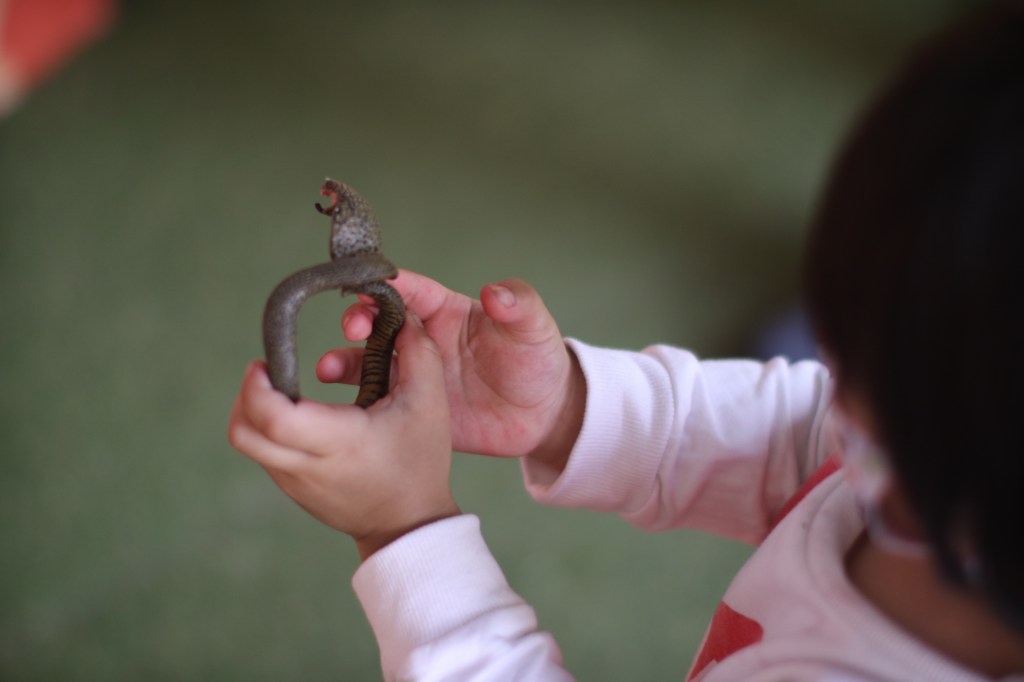 Aki loves the Giraffe area for another reason.. We let him pick one toy each visit as a souvenir! Last time he picked the snake bangle and this time, the red dinosaur toy in front of him.