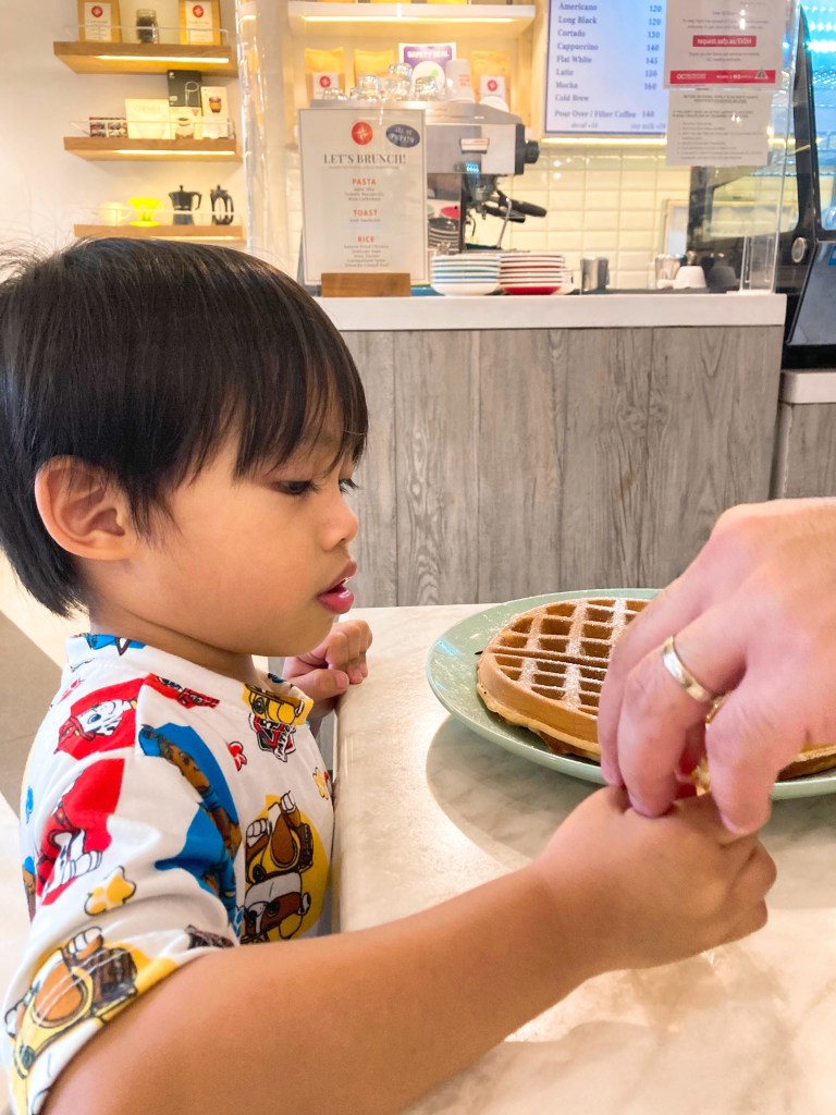 We ordered from their All Day Breakfast menu: Breakfast Tocino for Jus and Buttermilk Waffle for Aki 👶🏻 He orders his own meal now uwu 🥹 I had their latte which is SO GOOD! Legit coffee!