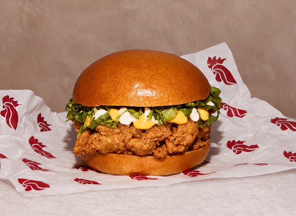 Crispy coated spicy chicken in a bun with cheese, garlic aioli, and lettuce