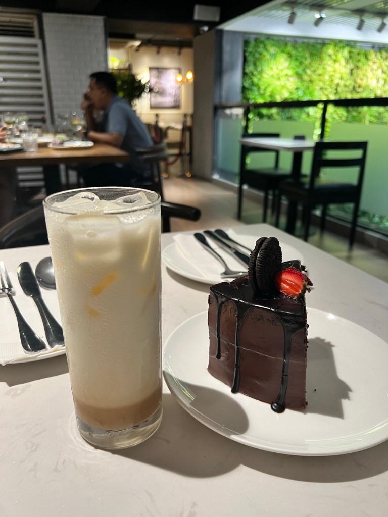 I had iced Spanish latte and a slice of cake with Oreo and Strawberry on top 🍓