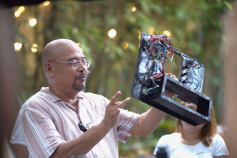 Arturo Tahup, Director for Community Resilience at the Institute for Climate and Sustainable Cities (ICSC) holds up a TekPak, or portable solar-powered device, that can provide solar energy to off-grid households.