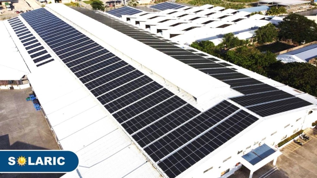 A bird’s-eye view of a sprawling solar farm atop a factory complex, showcasing the industry’s embrace of sustainable energy
