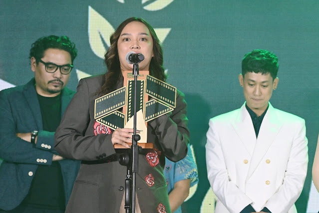 Fleeting director Catsi Catalan delivers a speech after receiving the Puregold Always Panalo award in the full-length category.